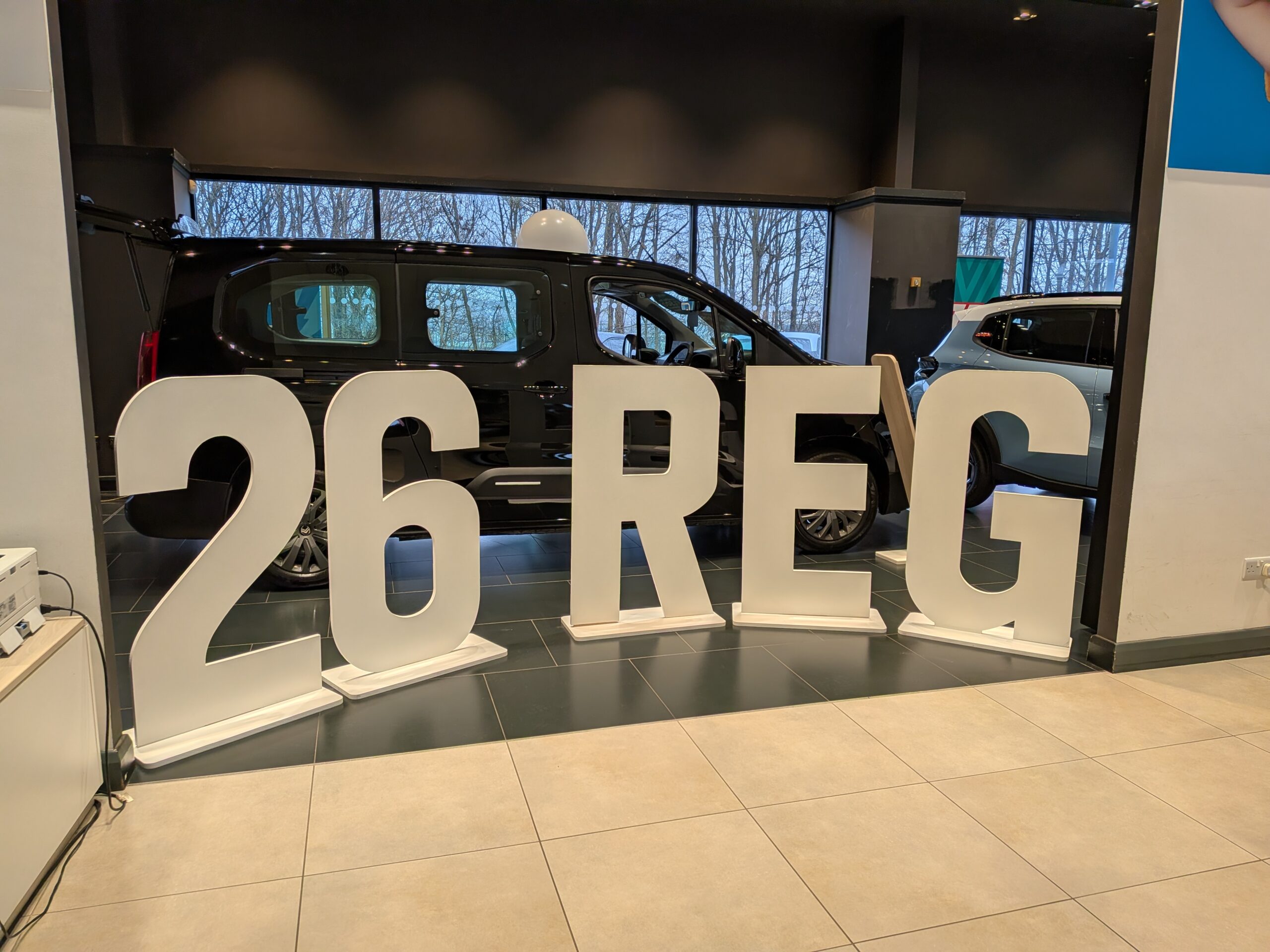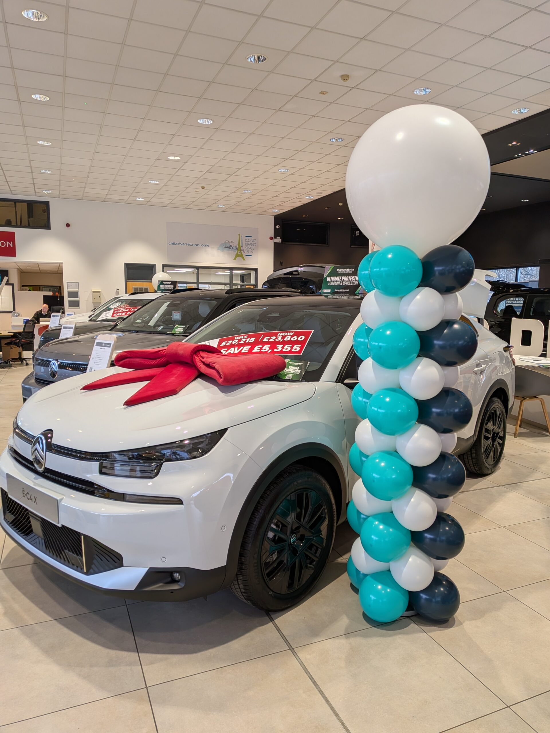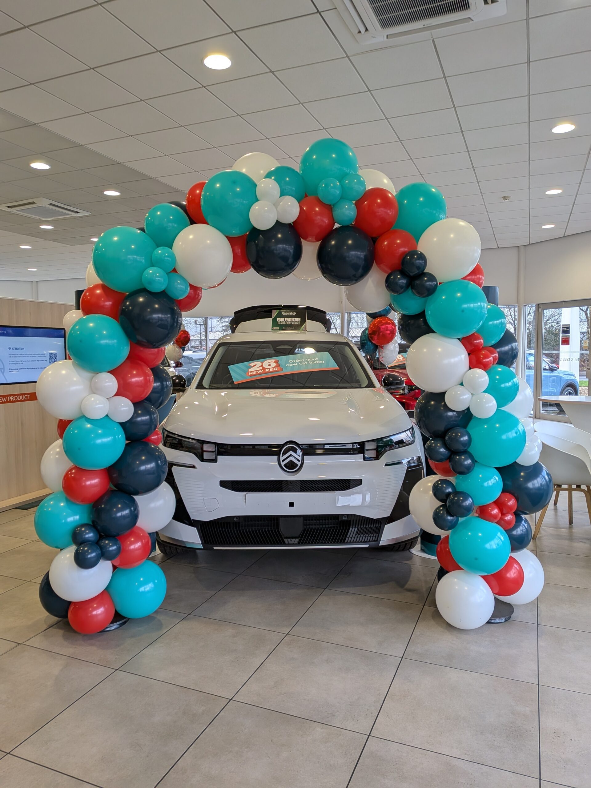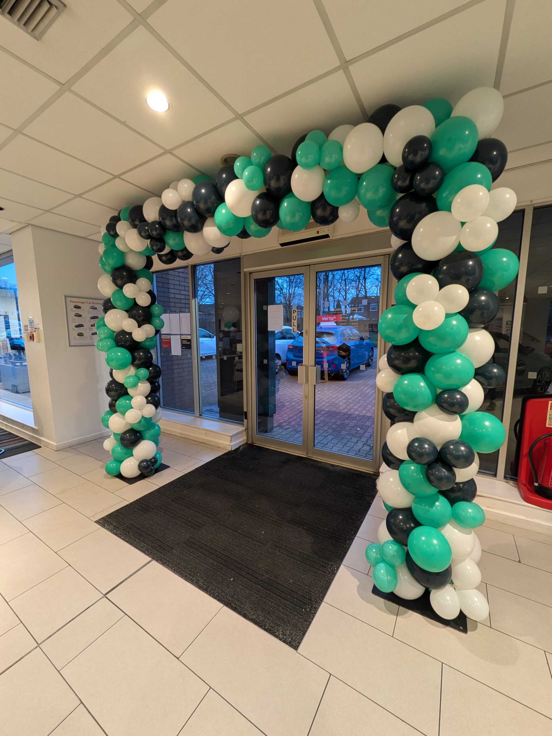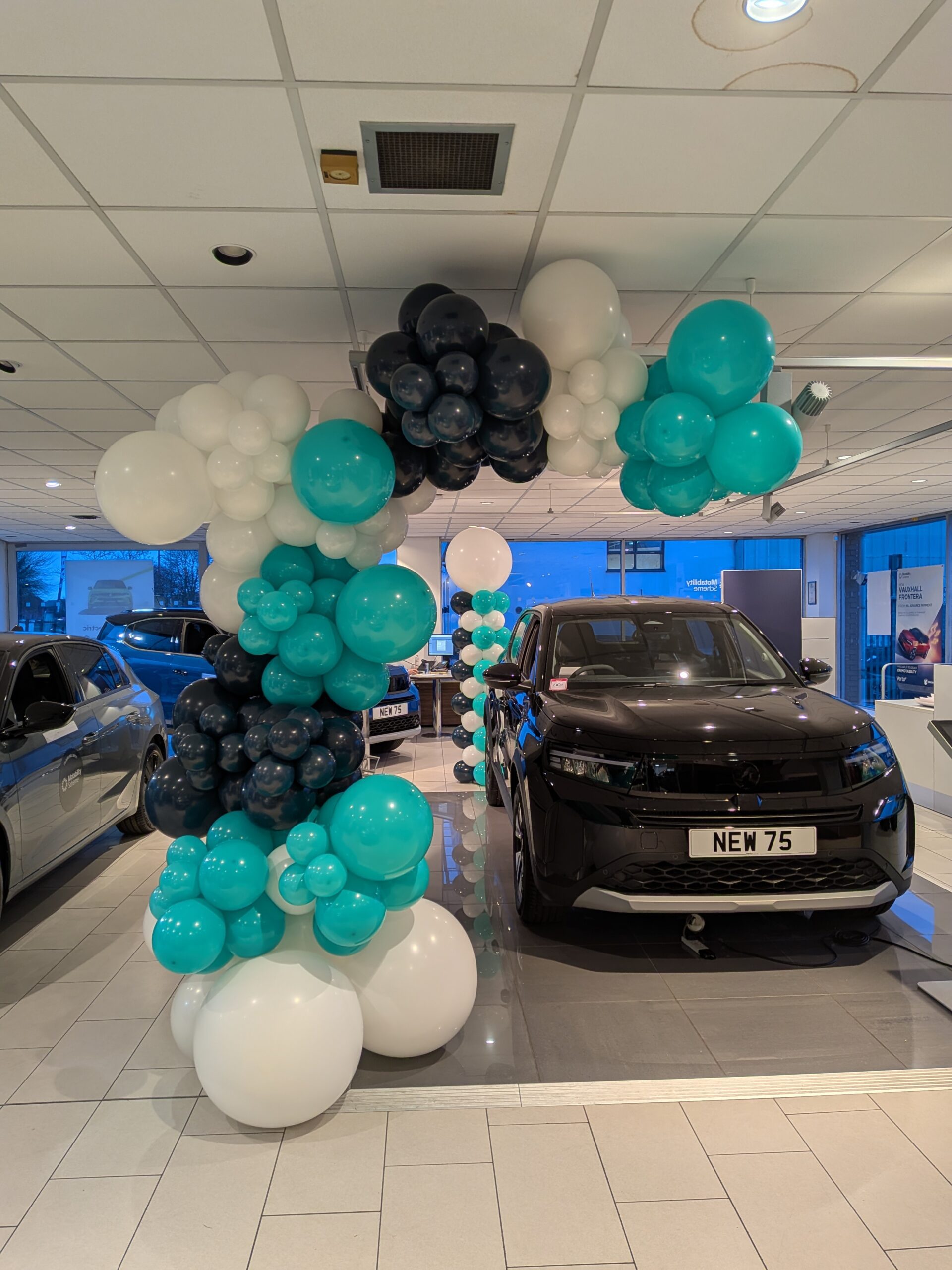 Balloon arch, ceiling balloons, bouquets and letter balloons for car showroom decoration